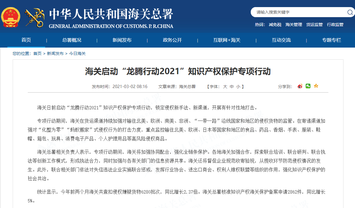 一直以來(lái),海關(guān)始終保持對(duì)侵權(quán)商品“零容忍”,不斷出重拳強(qiáng)化知識(shí)產(chǎn)權(quán)全鏈條保護(hù)。2020年海關(guān)總署部署全國(guó)海關(guān)密集開(kāi)展“龍騰行動(dòng)2020”、寄遞渠道“藍(lán)網(wǎng)行動(dòng)”、出口轉(zhuǎn)運(yùn)貨物“凈網(wǎng)行動(dòng)”等知識(shí)產(chǎn)權(quán)保護(hù)專項(xiàng)執(zhí)法行動(dòng);不斷升級(jí)對(duì)新興業(yè)態(tài)知識(shí)產(chǎn)權(quán)保護(hù),嚴(yán)打跨境電子商務(wù)領(lǐng)域侵權(quán)違法行為,強(qiáng)化對(duì)侵權(quán)高風(fēng)險(xiǎn)防疫物資的甄別和查處。2020年全國(guó)海關(guān)共扣留侵權(quán)嫌疑貨物5618萬(wàn)件,同比增長(zhǎng)20%。